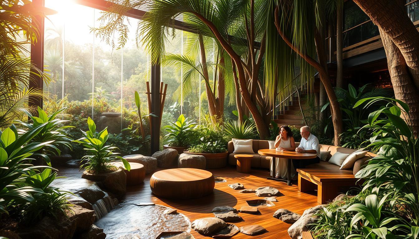 Pense em tons terrosos, formas orgânicas e iluminação suave. Tudo isso não é só bonito, é acolhedor. É o tipo de lugar onde a gente não quer só entrar; quer ficar. Quer se sentir parte de algo maior, sabe? É quase como se o espaço dissesse: "ei, você importa, e eu também me importo com o mundo.”
